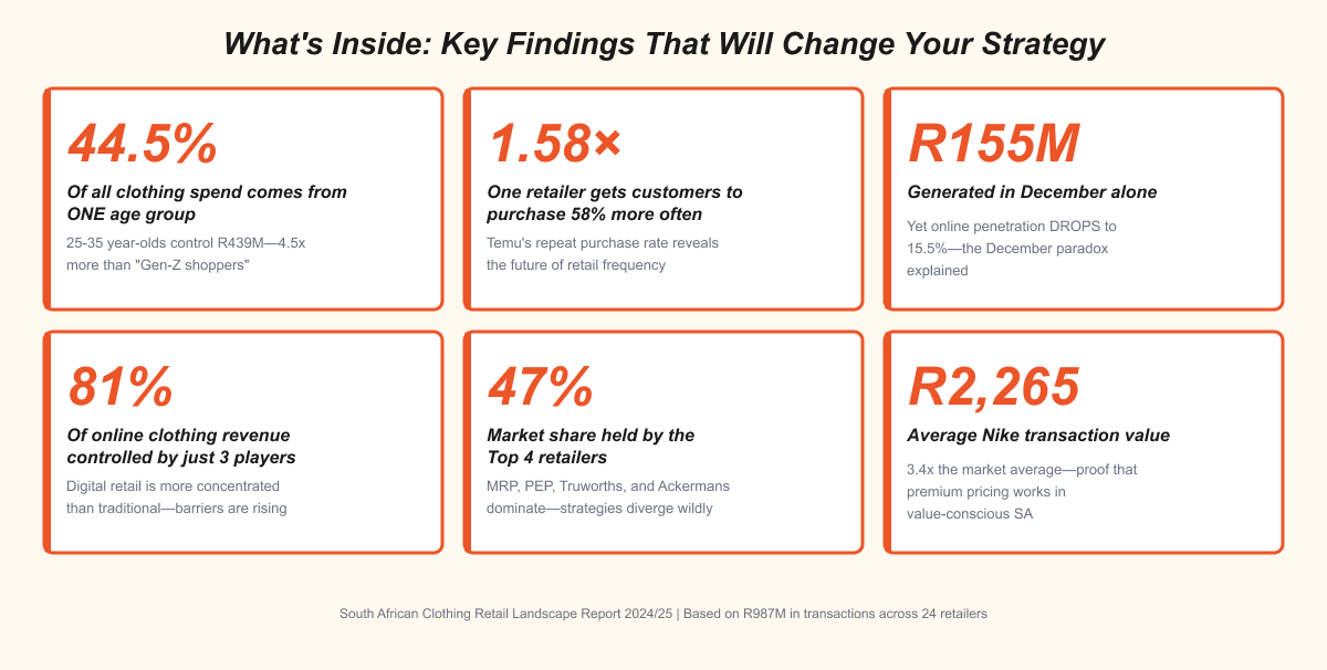 Based on real bank statement data from over 2 million transactions, this report reveals the hidden patterns driving South Africa's clothing retail market—and the strategic opportunities most brands are missing.